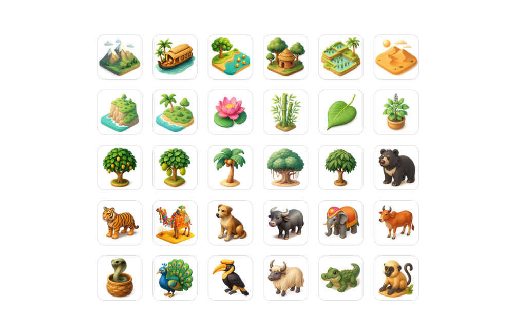 Banyan trees, paddy fields, mangoes, peepal leaves and more - this set reflects India's natural beauty and rural life.